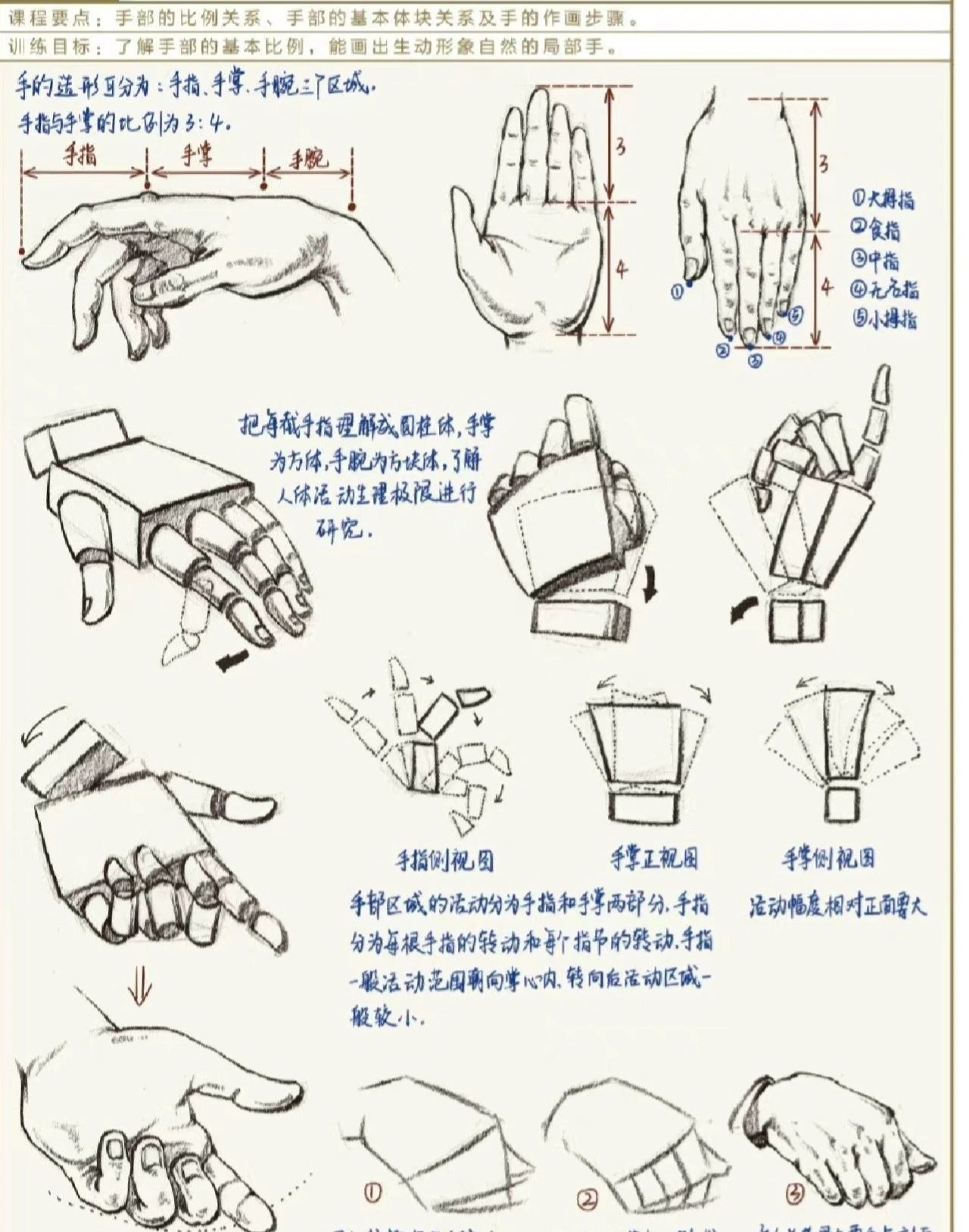 手是2/3個頭長,手呈扇形打開,手指要畫的方一些,手指和手掌的比例為3:4。