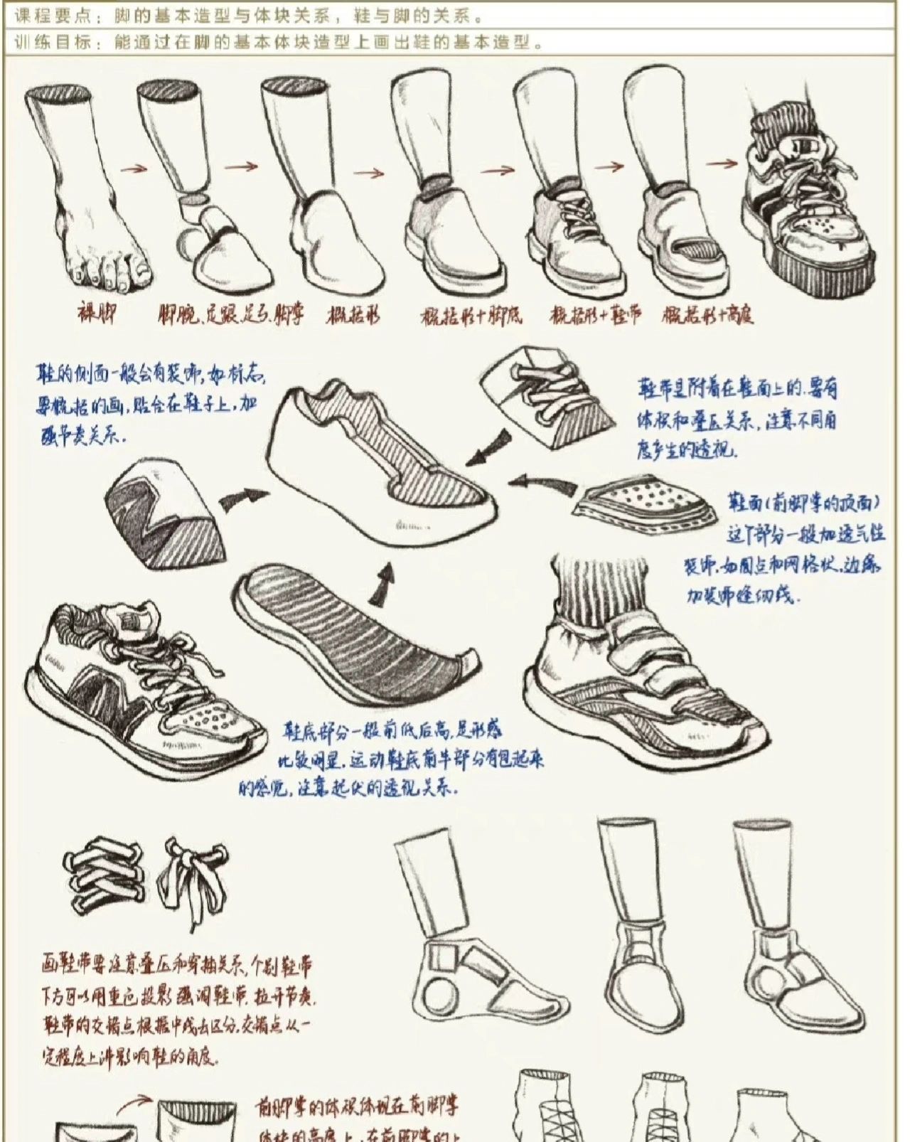 腳是一個頭長。腳踝由一個圓柱體組成,腳掌是一個扁平的梯形棱柱,任何角度,把鞋子的透視畫出來。