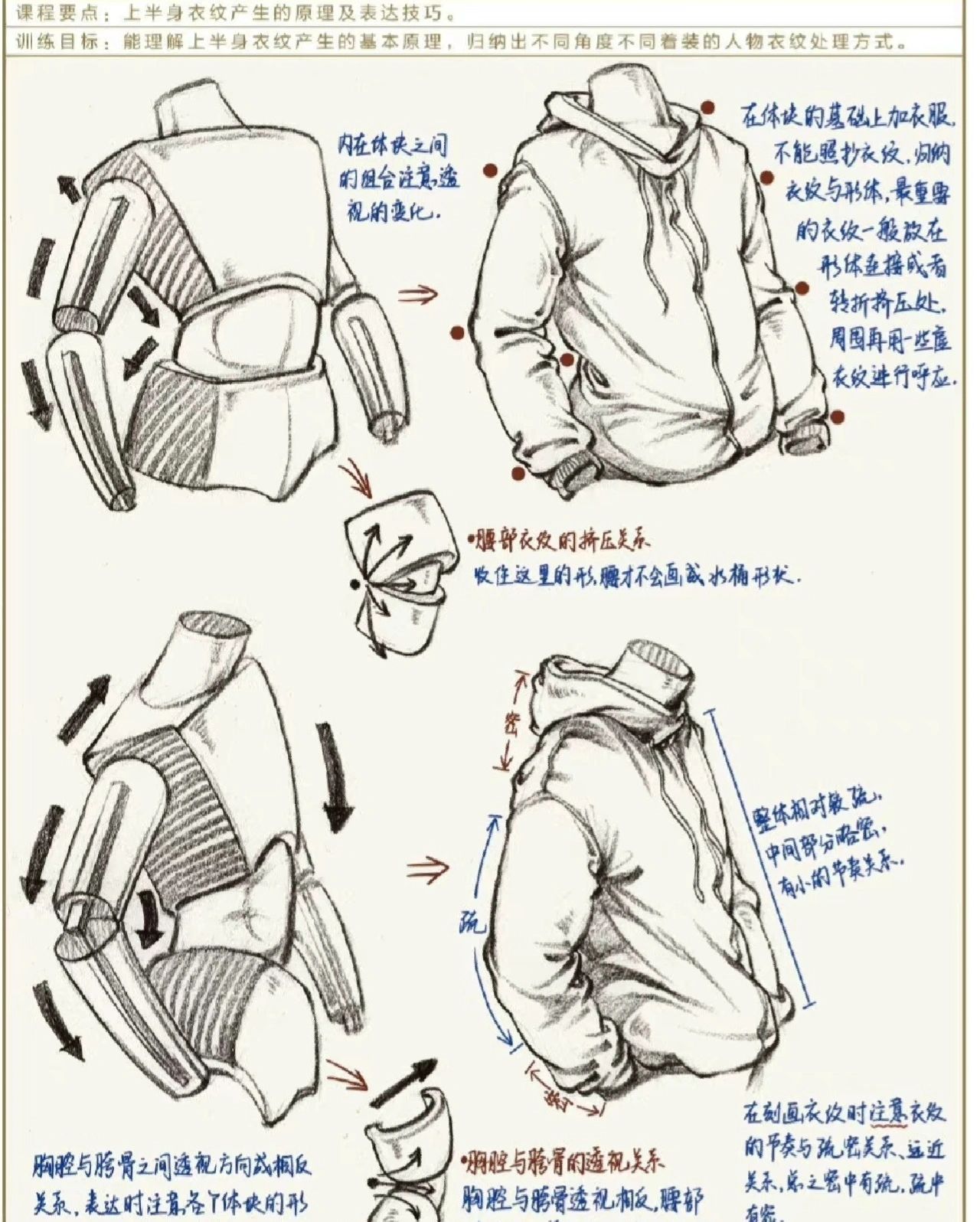 腰是胸腔和胯部的連接,控制上半身大動態,大臂為1.5個頭長,小臂為1個頭長。肌肉當成幾何體畫,衣紋不要抄,理解體積之后跟體積走。