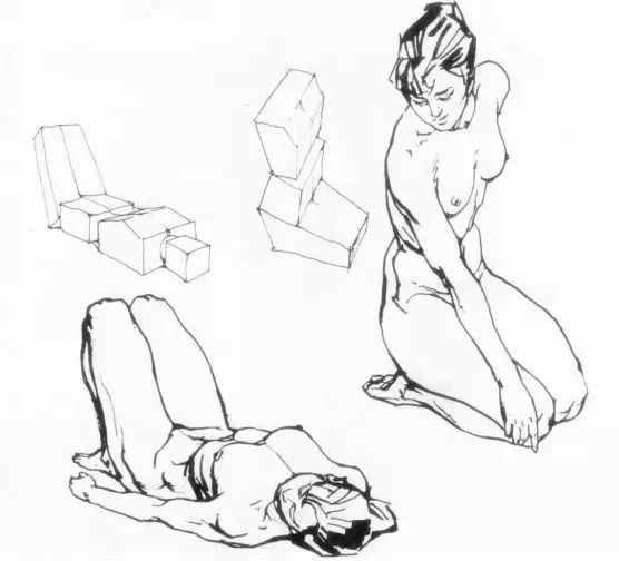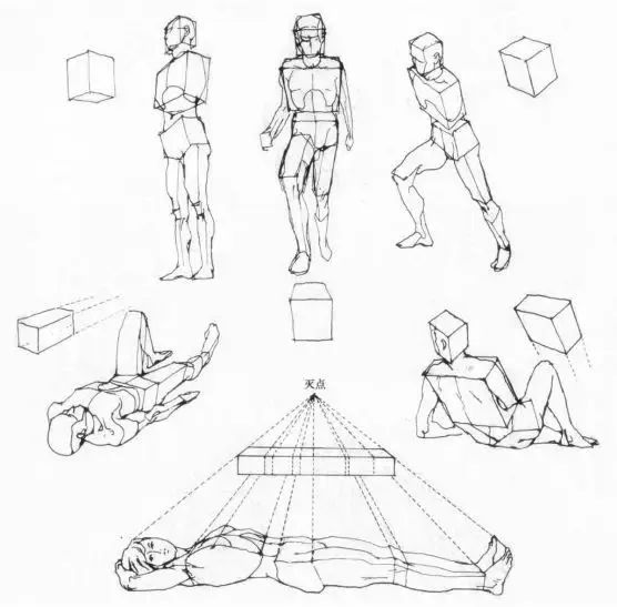 人體繪畫需要在平面上表現空間感和立體感,其表現的過程中需要運用客觀的透視規律。人體透視能使人體在圖面空間中“站立”起來,使人體的塑造具有深度感。對于人體透視的研究,可以通過對人體形態進行幾何形體的概括,從而快速分析和正確理解人體在空間形成中的透視關系。