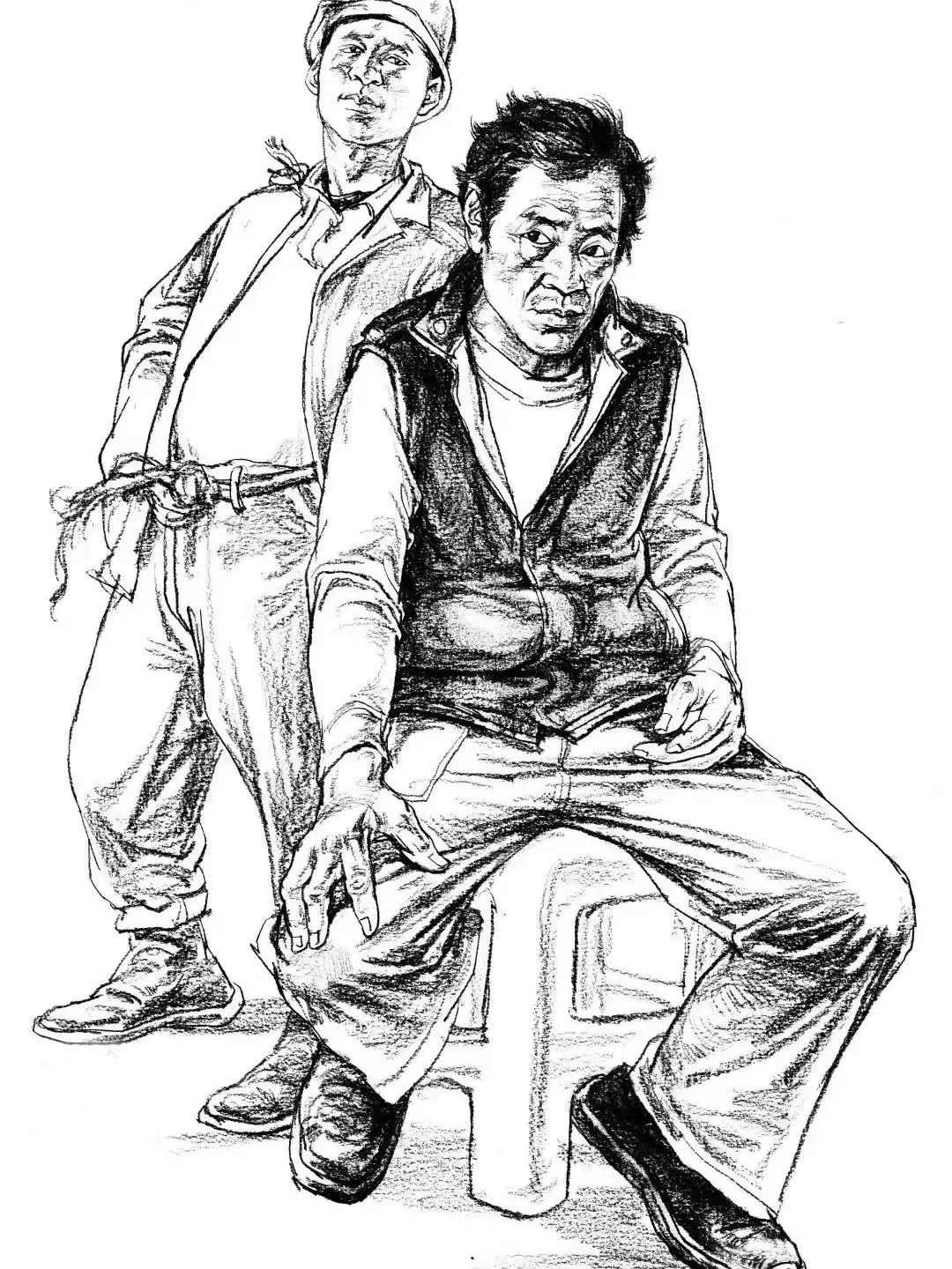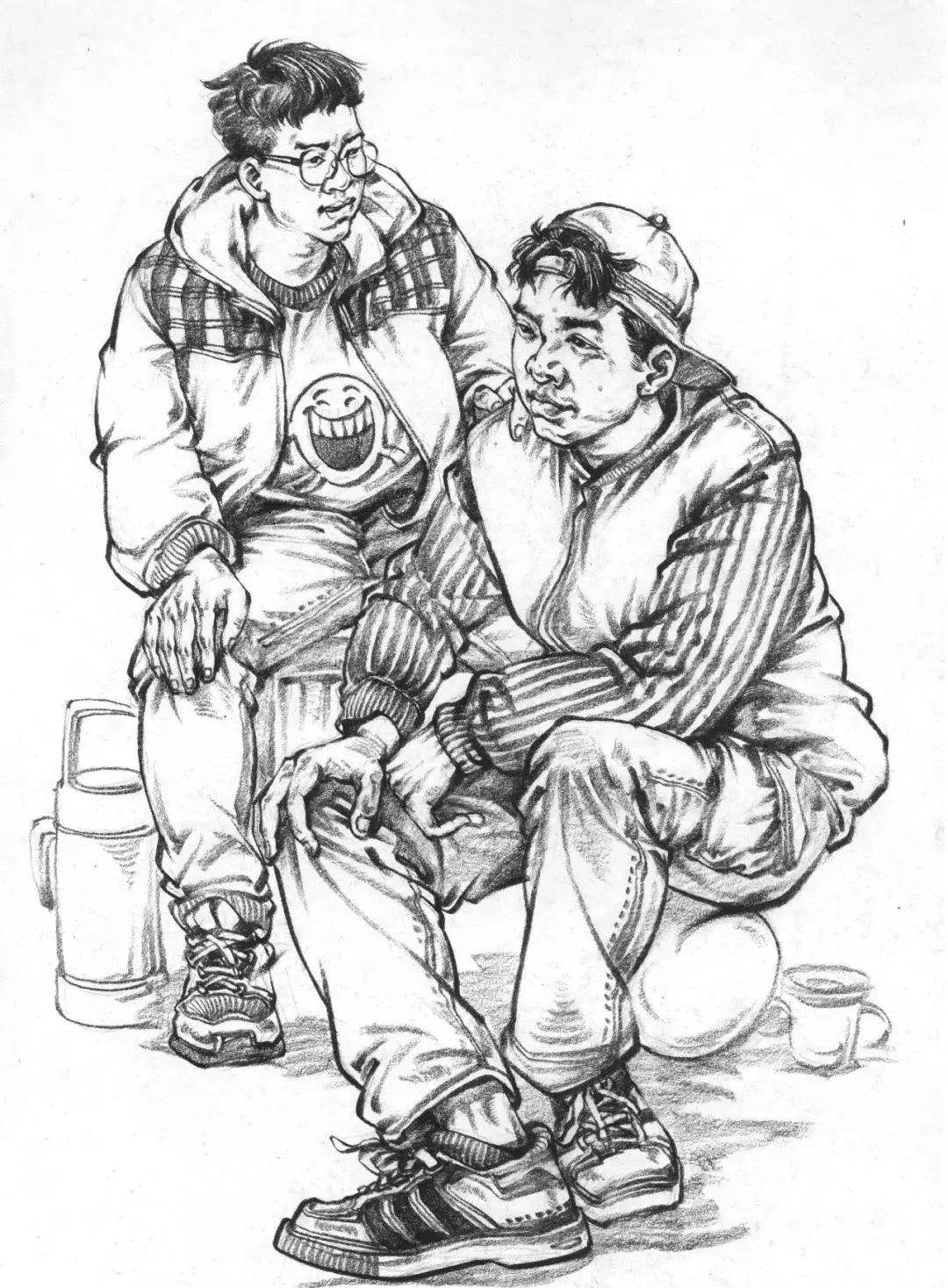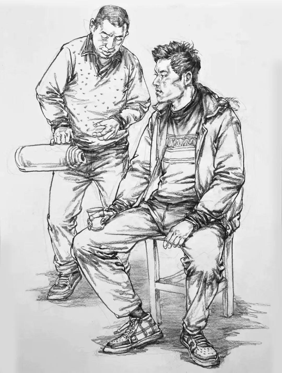 首先我們的畫面一定要有互動,這是組合速寫與單人速寫最大的不同,不是說把幾個人放在一張畫里就是組合速寫,而是這幾個人之間一定要有交集,哪怕眼神沒有互動,在肢體和環(huán)境中也一定要把這種互動的關(guān)系表現(xiàn)出來。