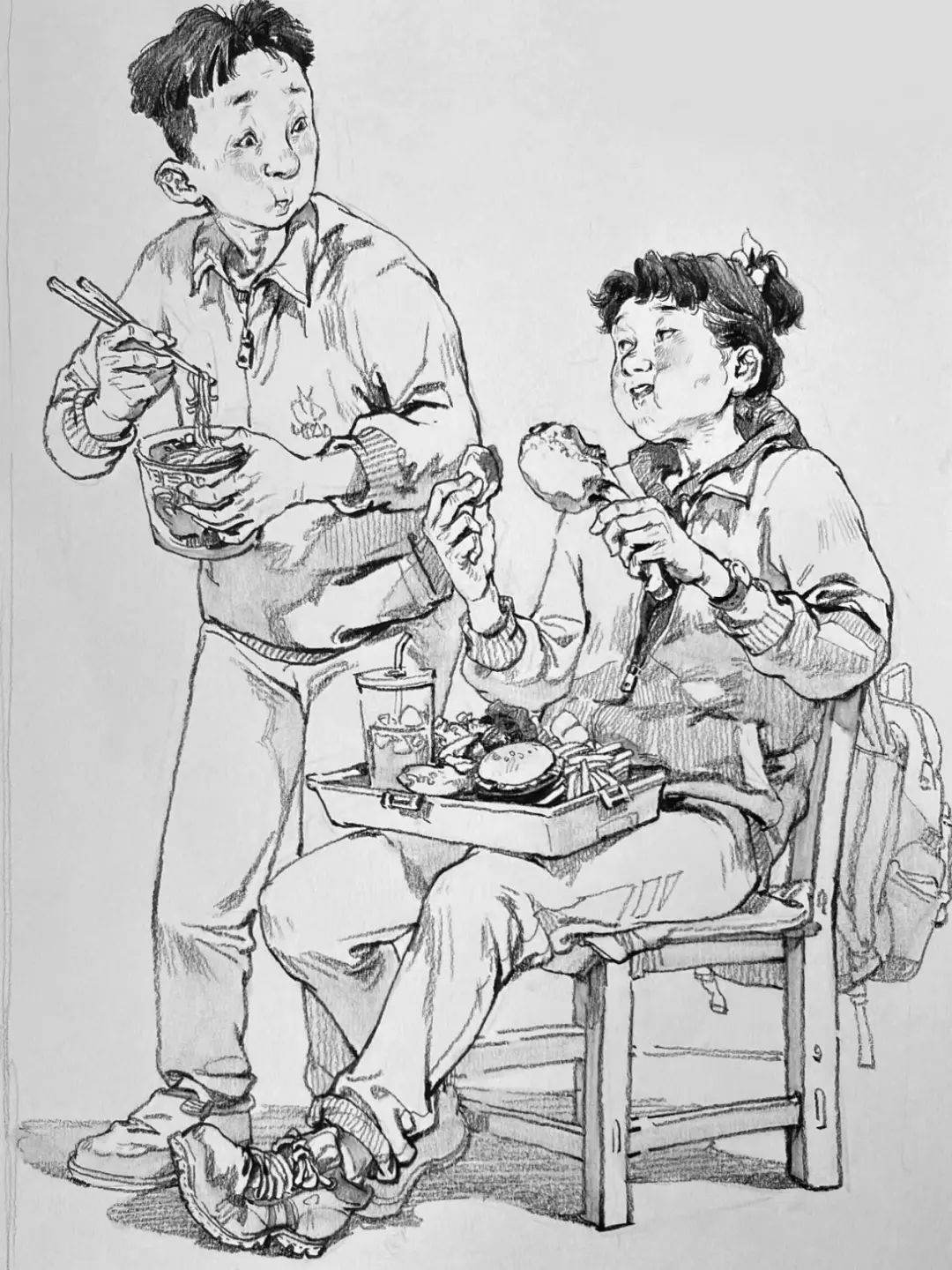 組合速寫要有一定的故事性,這點(diǎn)和場景速寫比較像,即使沒有很豐富的場景,雙人速寫有了故事性也會更有可看性,老師能從你的畫面中看出來生活的味道,這是高分至關(guān)重要的地方,要學(xué)會利用一些小的道具來營造畫面氛圍,同時要注意前后的空間關(guān)系,近實(shí)遠(yuǎn)虛。