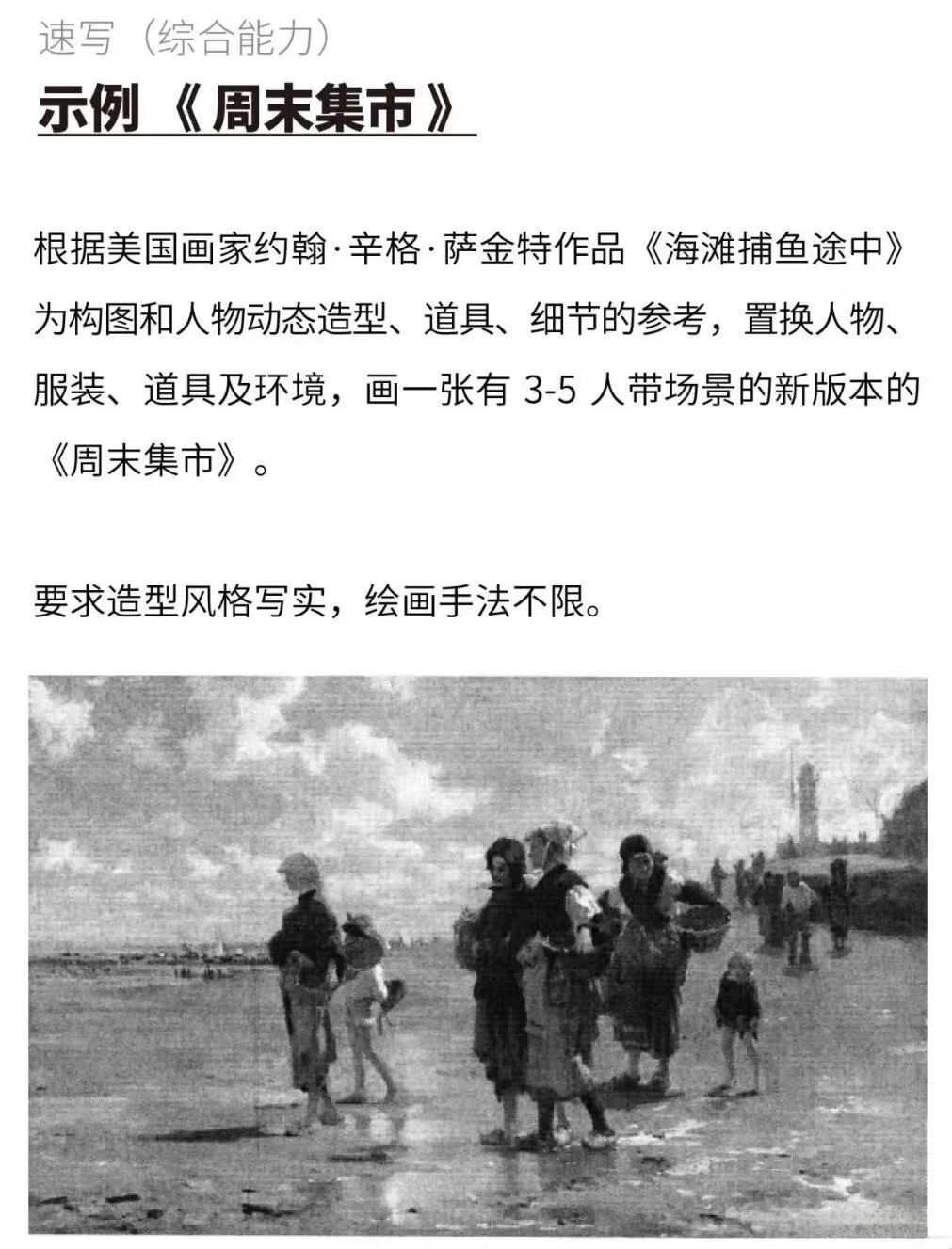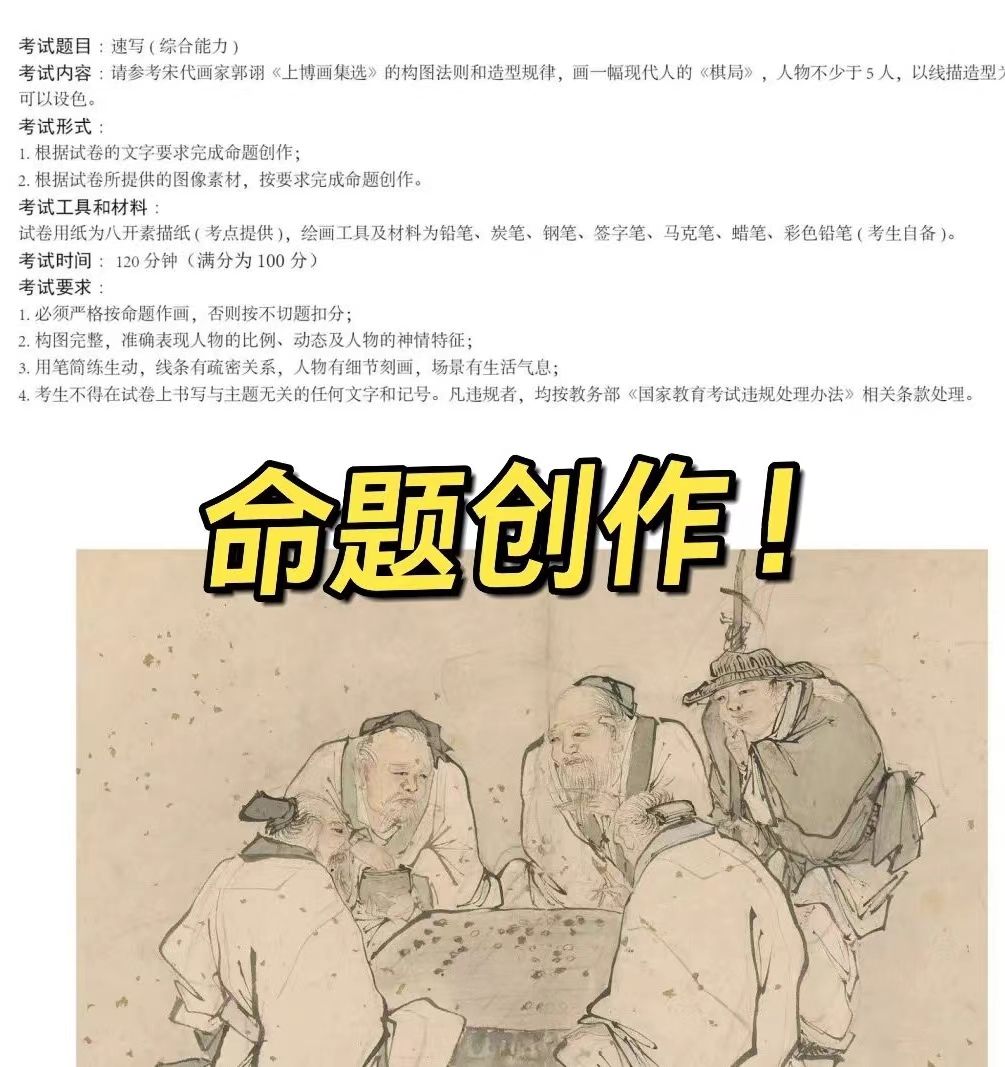 名畫置換都是會提供構(gòu)圖,人物動態(tài)都會參考,你只需要根據(jù)畫面去做改動,增加你的創(chuàng)意就好了,相對于往年的純默寫來說,其實會更簡單一些,命題創(chuàng)作的考題分純文字闡述,照片+文字闡述,照片+文字闡述,你需要參考考題給到的素材圖,去基本還原素材圖的構(gòu)圖,人物,動態(tài),你要記住人物是重心,你要把人物的性別,體態(tài),年齡,職業(yè),這四個特征表達清楚,這樣才能貫穿主題,背景可以弱化,不要喧賓奪主。