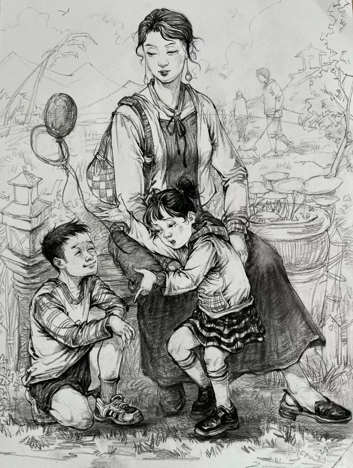 如果是三個人,那么你需要重點刻畫這三個人的細節(jié),分析他的人物動態(tài),神態(tài),比如他的眼睛在看向哪里或者看向誰,你要看看它的前后景關(guān)系,是環(huán)境在前呢,還是人物在前呢,參考完構(gòu)圖,環(huán)境,之后再就是去置換,人物的身份,服裝,道具,以及環(huán)境,畫一幅新的主題作品,你可以把大人置換成小孩,褲子置換成裙子,玩具車置換成寵物,這些置換后的東西組合在一起,最終會串聯(lián)成一幅完整的故事畫面。