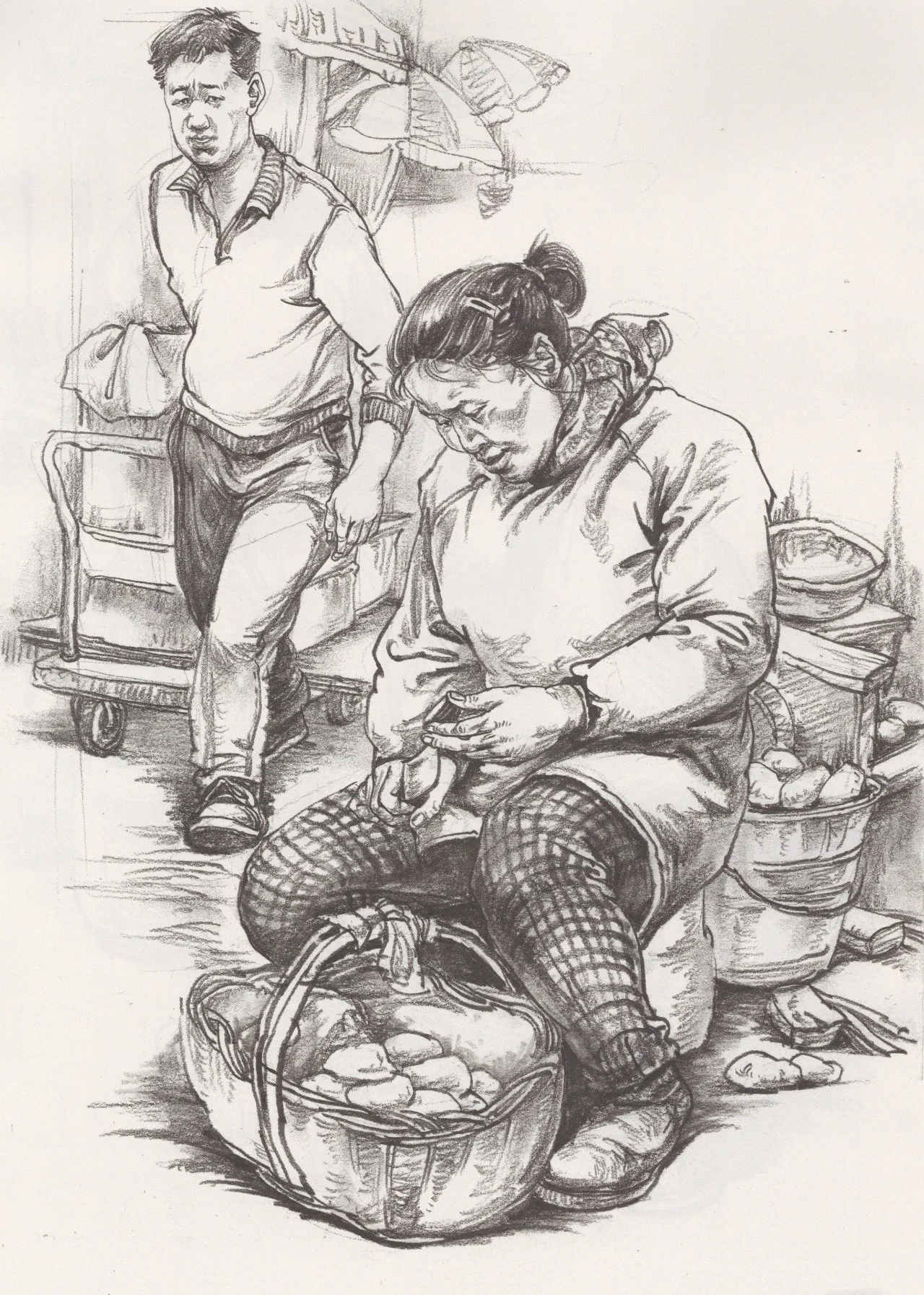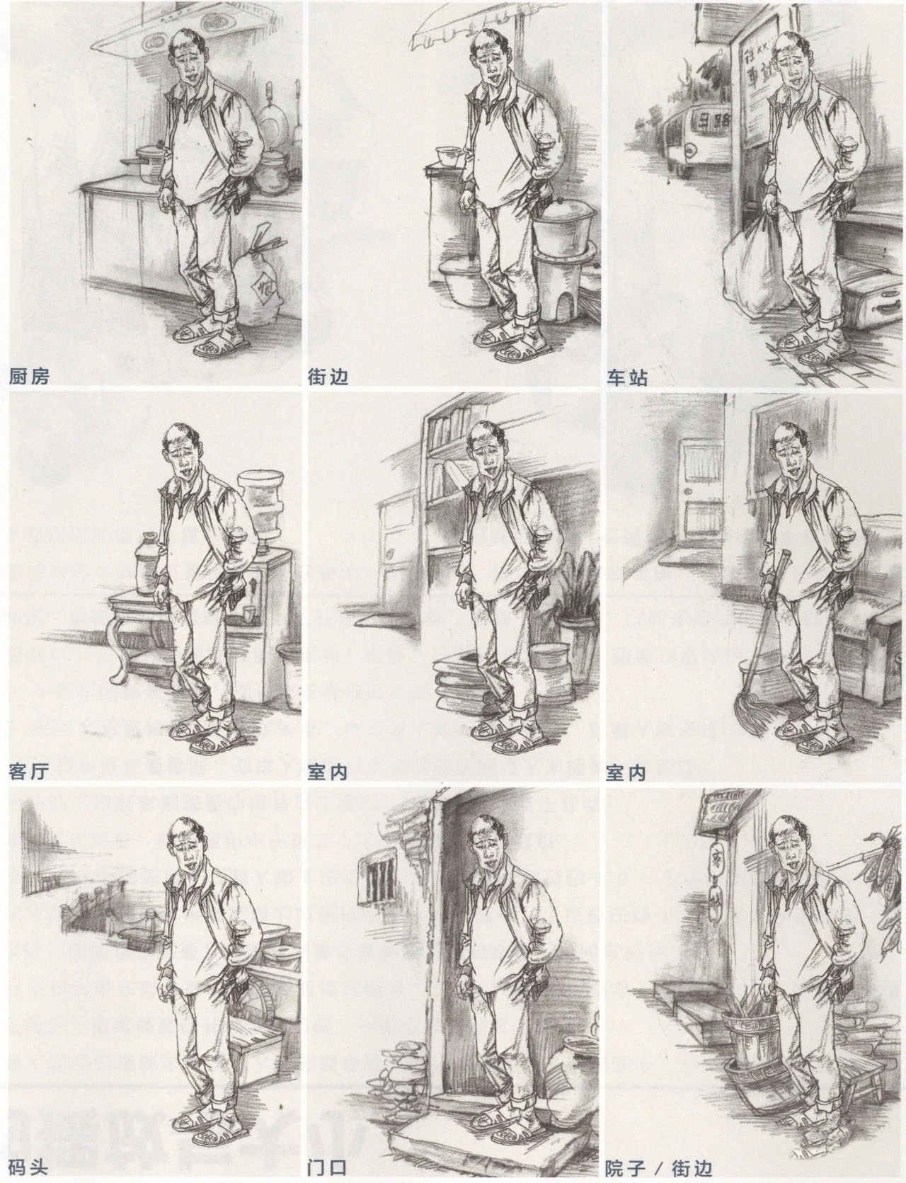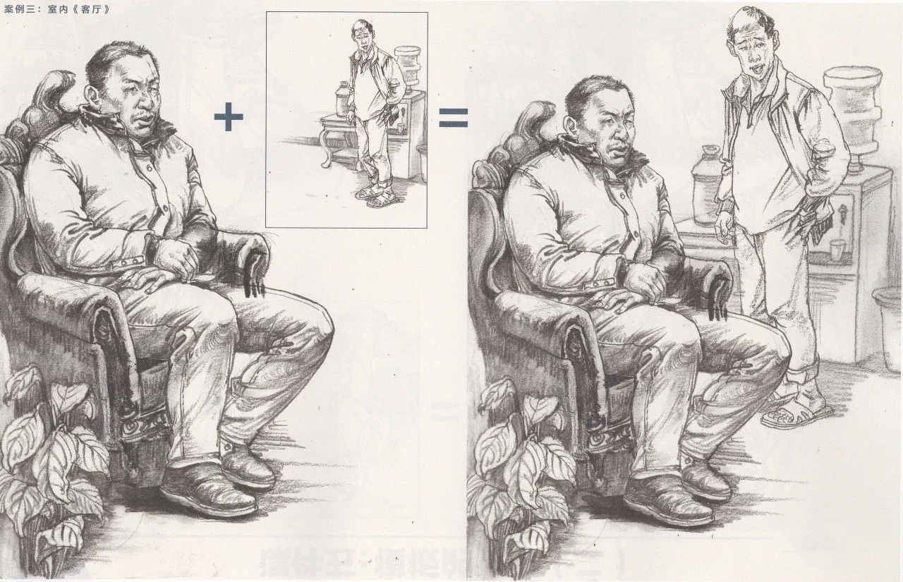 速寫中的場景模板,可以套用1,2,3原則,1擋2,2擋3,注意落地點在同一空間。另外搭配時注意道具要有高矮胖瘦的形狀組合在一起,講究點、線、面的搭配,道具就會有層次、有美感。