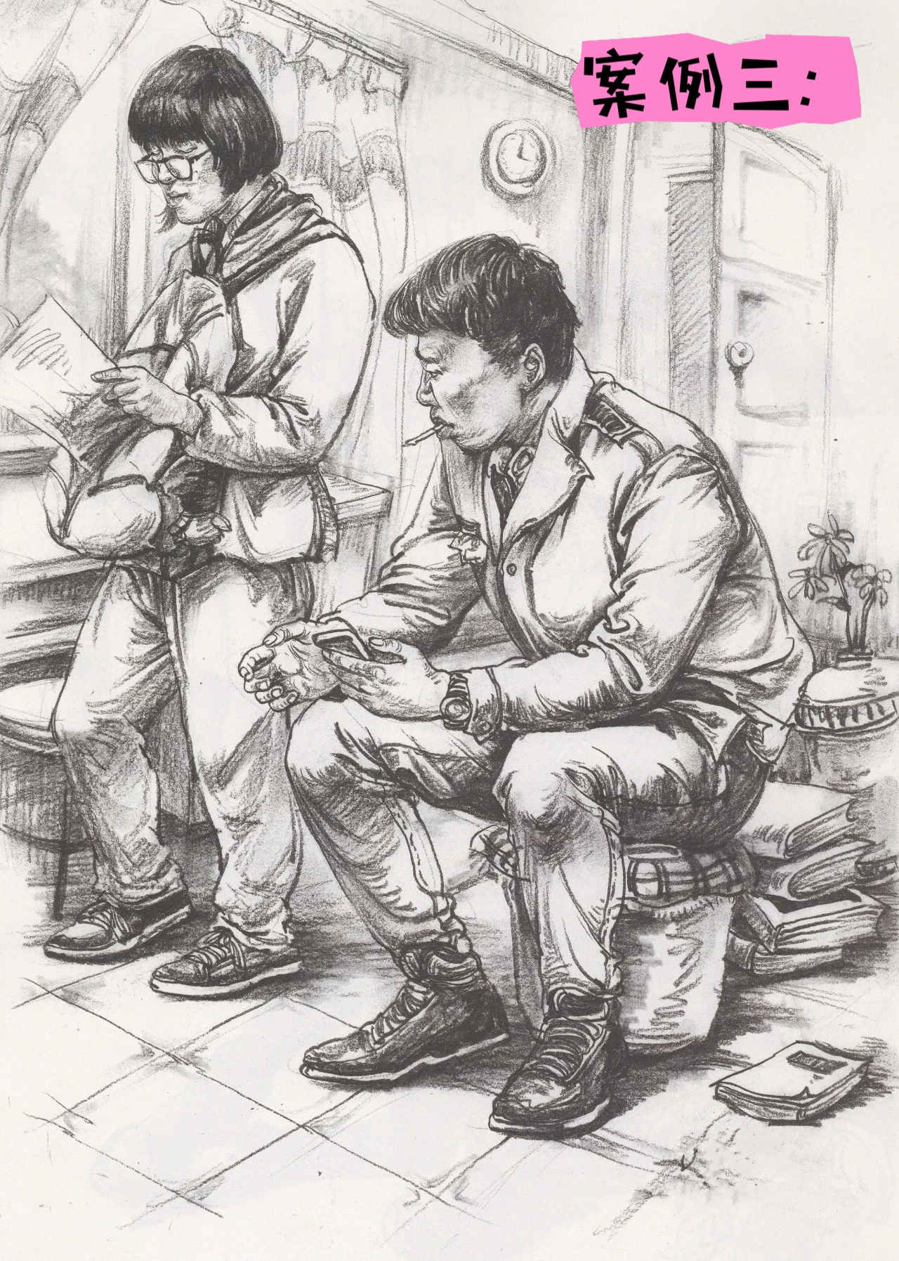 ?案例二:坐姿女青年安排在了視覺中心偏左的位置,次要人物則放到主要人物的后面相對弱化處理,形成節奏。