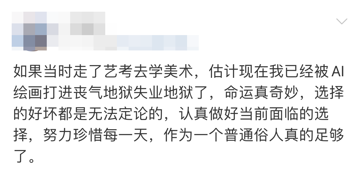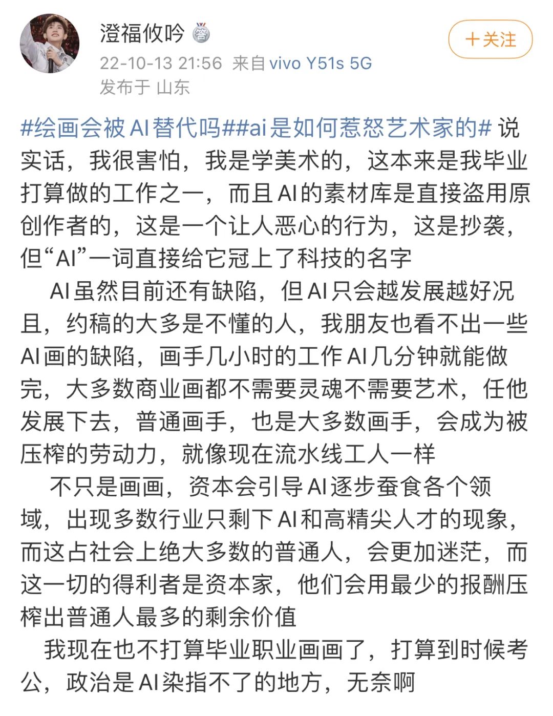 而對有志成為畫家的年輕學子來說,AI繪畫似乎也帶來了職業認同的危機。在山東就讀美術專業的學生“澄福攸吟”在網絡平臺上表達了對未來職業生涯的憂慮與恐懼,她覺得自己成為職業畫師的理想將要破滅在現實面前。