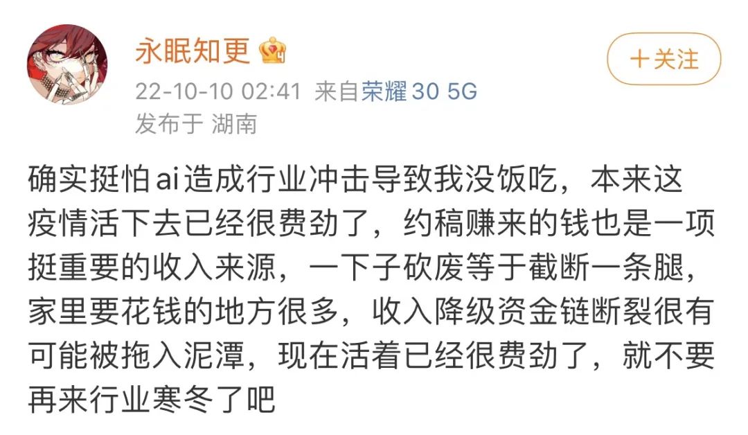 2022年開始,面對“AI繪畫”這個闖入者,確實有不少畫師開始擔心自身地位難保。畫師“永眠知更”擔心AI繪畫的出現會減少自己的約稿量:“約稿賺來的錢也是一項挺重要的收入來源,一下子砍廢等于截斷一條腿。”